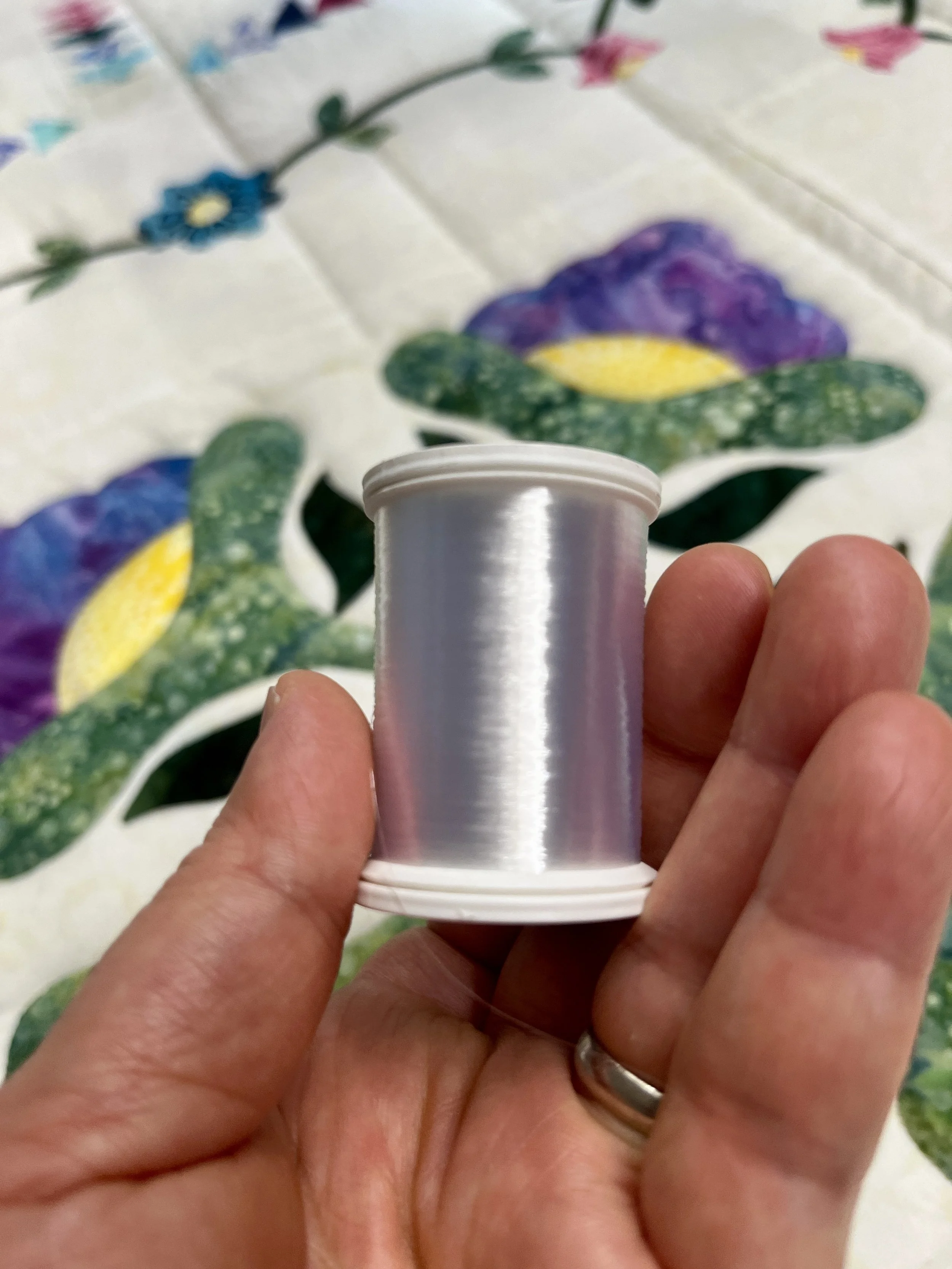 When working with multi-color appliqué, thread choice matters. For this quilt, I used polyester invisible thread from Sulky (I just had this one in handy 🙂). Invisible thread saves you from constantly changing thread colors and blends right in across different fabrics, which makes it a great choice for stitching in the ditch around appliqué.