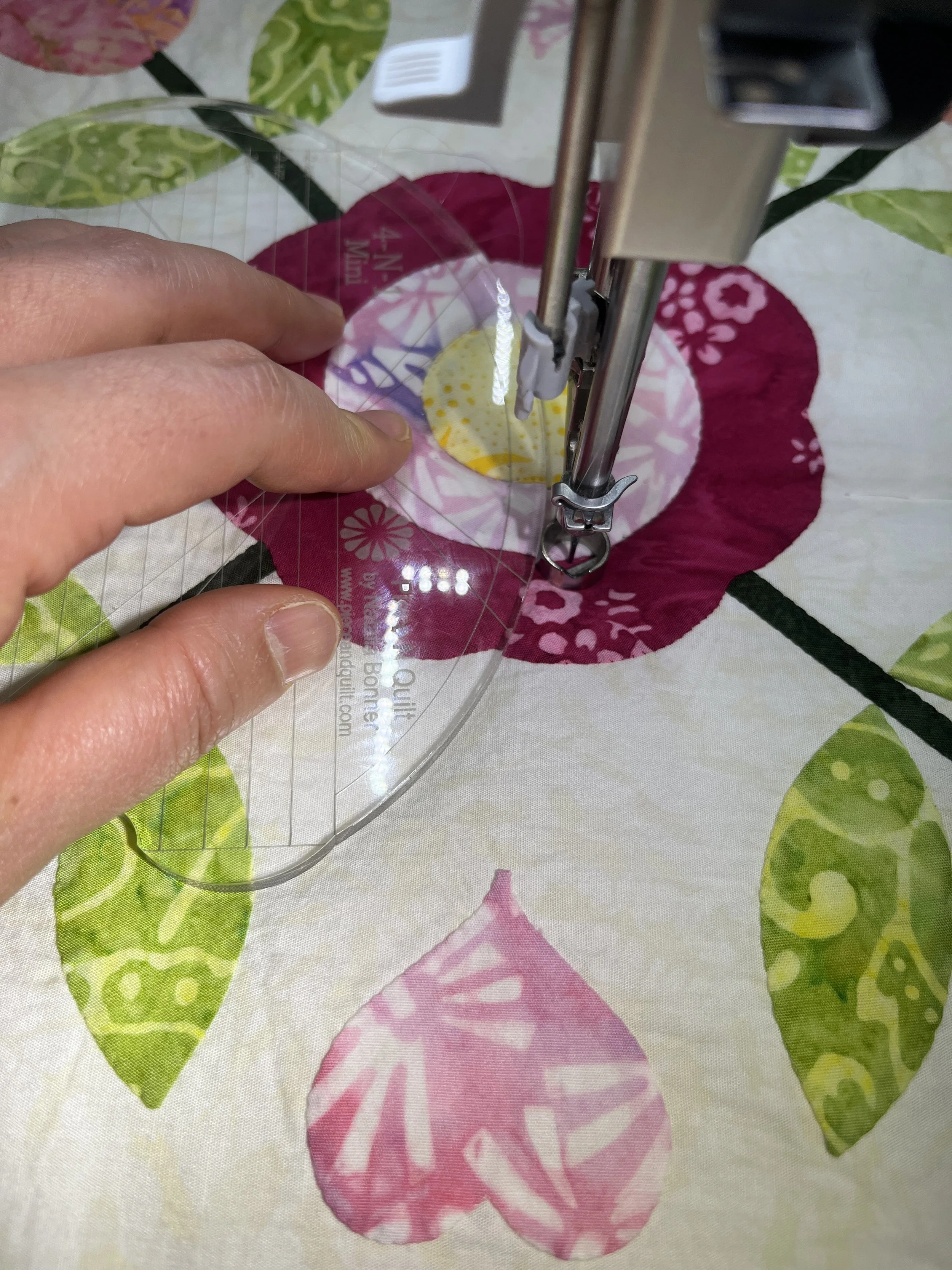 Watch the video below to see a real-time demonstration of how I stitch in the ditch around appliqué using a longarm machine. In the video, you can watch how I move the ruler as needed and switch to stitching without it when that feels more natural.