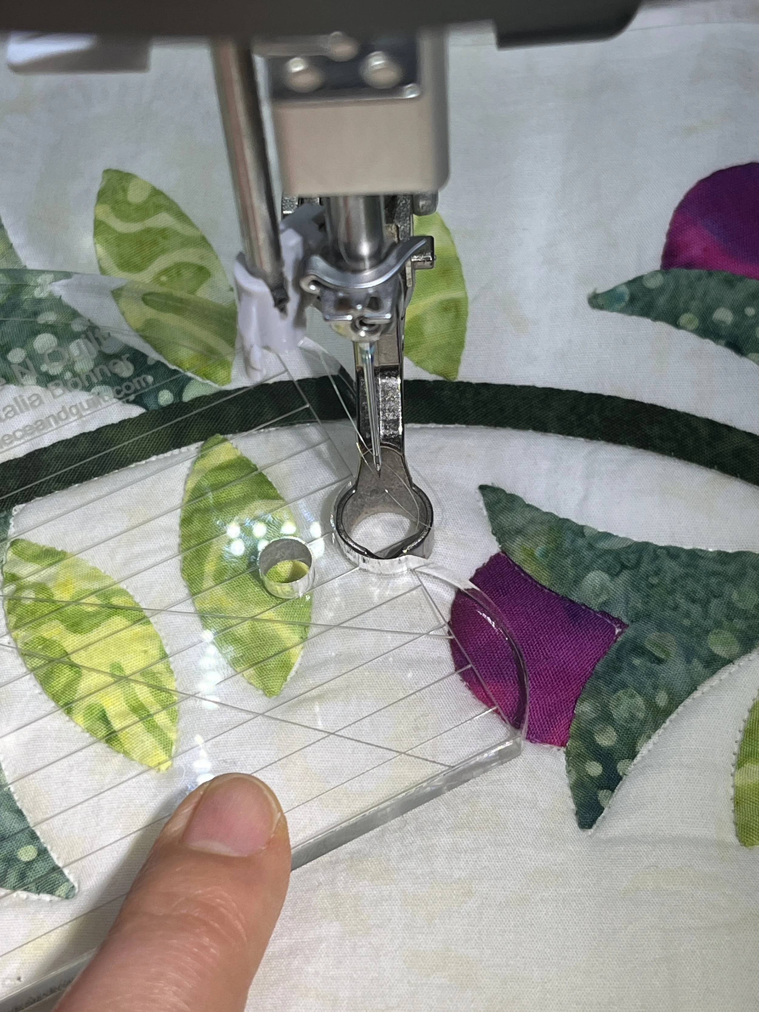 For added stability and control on the longarm machine, I like to use a ruler. The ruler I’m using has a small half-circle cutout that fits around the ruler foot, which helps maintain smooth, controlled movement close to the appliqué edge. That said, a specialty ruler is not required to achieve clean stitch in the ditch results.